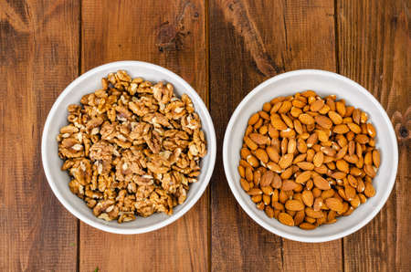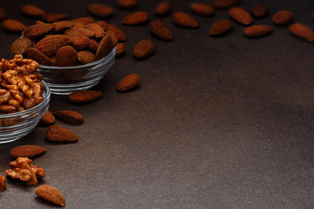 Close up bowl of almonds and walnuts on a dark background. Dried fruit to lower cholesterol. Negative space to write. Front view
