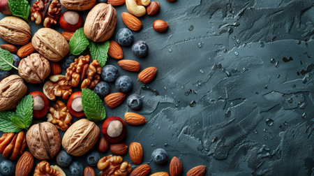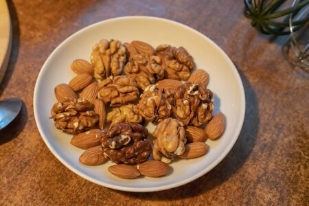 Various nuts and almonds, concept of healthy nutrition and lifestyle, copy space for text or inscription