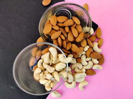 Top view of cashew nuts and almonds split from glass bowl on pink and black background