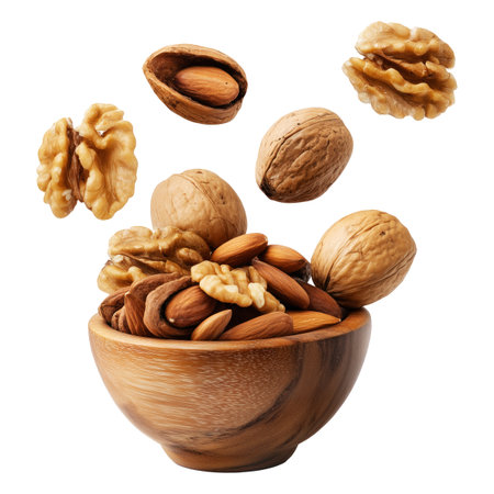 Assorted walnuts and almonds in natural wood bowl with some nuts floating above, isolated on white transparent background, concept of healthy snacks