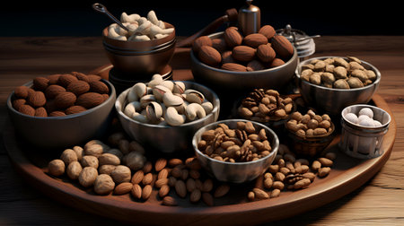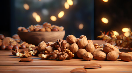 AI Generated. Nuts in a rustic wooden bowl creating a rustic and inviting display for snack enthusiasts