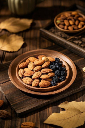 Almonds and raisins on a wooden plate