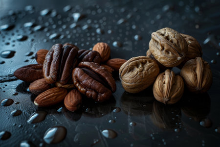 Almonds and walnut flat lay shoot in black background