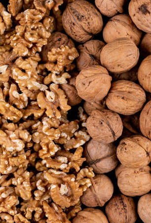 Top view raw and shelled walnuts texture background vertical
