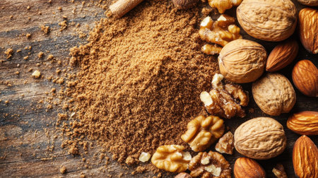 A collection of assorted nuts and ground spice scattered on a rustic wooden surface, perfect for culinary uses in baking and cooking.