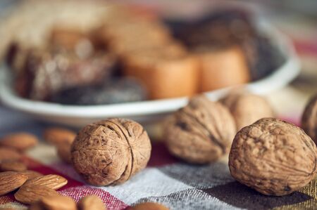 Raw walnuts closeup and sweets on background