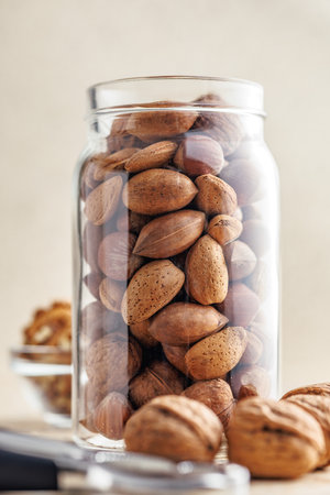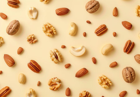 Assorted nuts on a light beige background, creating a natural and healthy food concept Various shapes and textures of nuts are scattered artfully