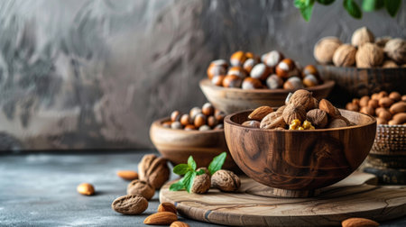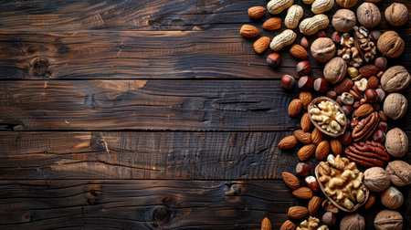 Assorted Nuts on Wooden Background - Healthy Snack, Protein Source, Variety of Nuts, Rustic Food Presentation
