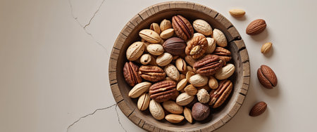 AI Generated. Overhead View of Mixed Nuts in Rustic Bowl