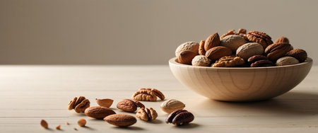 AI Generated. Bowl of assorted nuts including almonds walnuts and pecans on a light wooden surface with scattered nuts in the foreground and soft lighting