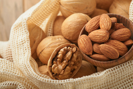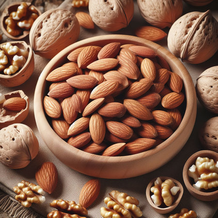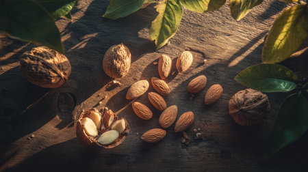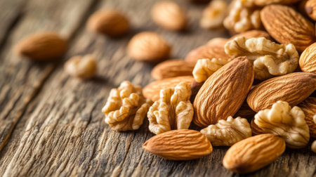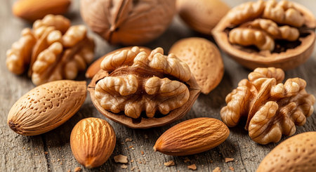 A close-up of raw almonds and walnuts scattered on a rustic wooden surface, showcasing the rich details and freshness of these nutritious ingredients.