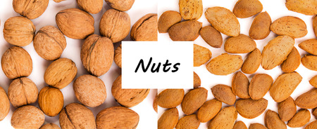 Walnuts and almonds on white background. Healthy organic food concept. Nuts close up. Top view. View from above with text nuts.