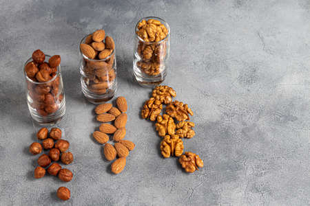 Almonds, walnuts and hazelnuts in a glass dish. Contains healthy vitamins and minerals. On a gray background. Copy space.