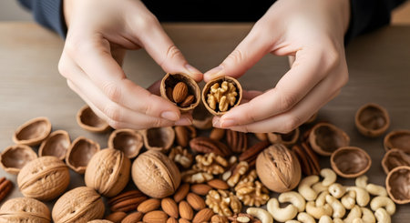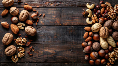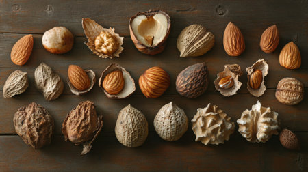An artistic arrangement of various nuts including almonds, walnuts, and hazelnuts on a rustic wooden table, perfect for healthy eating, culinary creations, and natural decor inspiration.