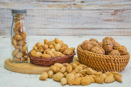 Almond, pistachio and walnut in a small plates which standing on a vintage wooden table. Nuts is a healthy vegetarian protein and nutritious food.