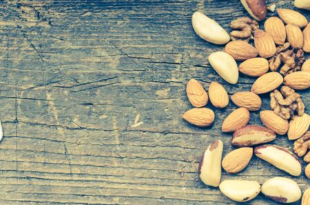 Concept - Nuts mix on old rustic wooden background with place for text. Almonds, Brazil nuts and walnuts. Healthy edible seeds food ingredient on the table. Top view. Directly above. Copy space.