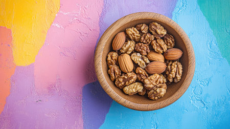 Create 10 prompts for stock photos related to Walnut kernel halves in a wooden bowl viewed from above on a colorful background Emphasizing healthy eating with walnuts Superfoods with copyspace with 100-200 characters and ending with