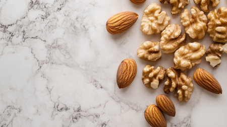A close-up shot of raw almonds and walnuts scattered on a clean kitchen countertop, highlighting their unique shapes and the appeal of natural ingredients.