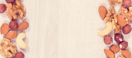 Composition of nuts , flat lay - mix hazelnuts, cashews, almonds on table background. healthy eating concepts and food background.