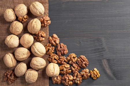 Walnuts on a dark concrete background. Nuts are a source of vegetable protein and vitamins. Flat top view, copy space.