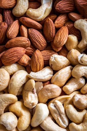 Half of the image is hidden by a mix of clean dried kernels nuts of different varieties