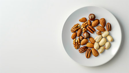An elegant display of various nuts like almonds, walnuts, pecans, and hazelnuts on a white plate against a white background, showcasing their beauty and health benefits.