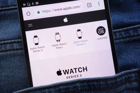 KONSKIE, POLAND - JUNE 11, 2018: Apple website about Apple Watch displayed on smartphone hidden in jeans pocket