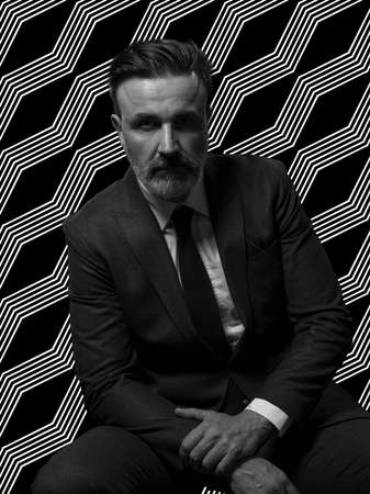 Black and white portrait of a stylish elegant senior businessman with a beard and casual business clothes against retro colorful pattern design background gesturing with hands