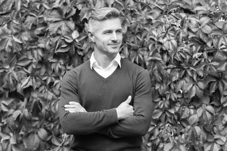 Smiling mature business man. Autumn portrait. Businessman in autumn park. Caucasian man has business casual style. Mature man face portrait. Businessman portrait outdoor. Confidence and success