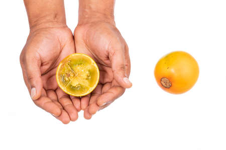 Solanum Quitoense - Lulo Or Naranjilla Tasty Tropical Fruit; In Male Hand On White Background