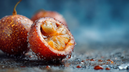 A captivating close-up of a fresh lychee fruit showcasing its juicy flesh and dew drops on a textured dark background. Perfect for culinary or health themes.