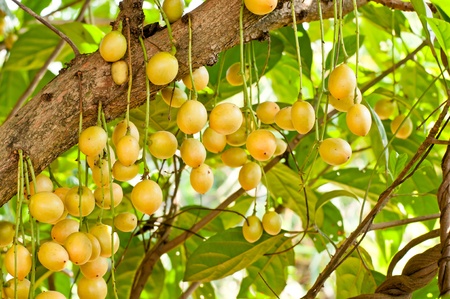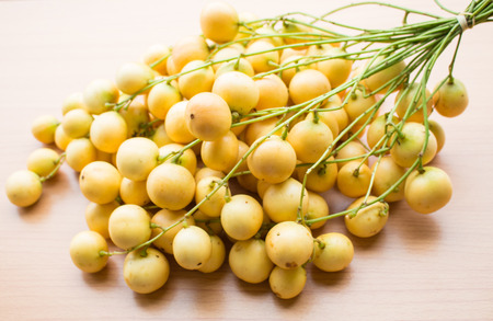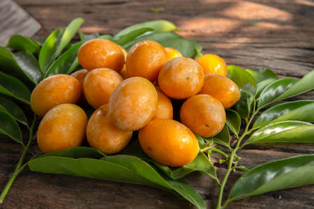 bunch of Thai fruits (Thai name Mafia) that have both. Sweet and sour taste on wooden floor.