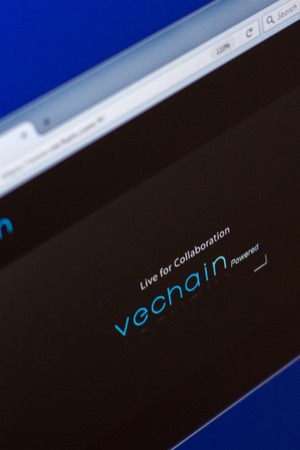 Ryazan, Russia - March 29, 2018 - Homepage of VeChain cryptocurrency on PC display, url - vechain.com