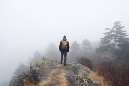 Hiker with backpack standing on the edge of a cliff in the fog with Generative AI.
