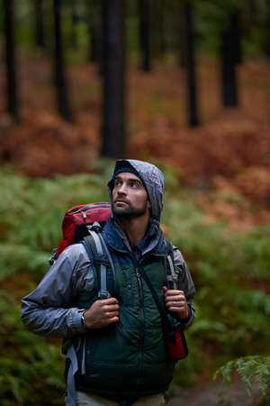 Lush, natural wilderness. Portrait of a young man wearing a backpack while hiking in the forest.