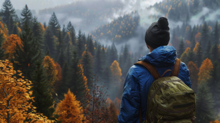 Man stands with backpack, autumn forest, foggy mountains, nature-focused art.