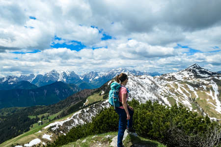 Hiker woman with backpack at summit of Hahnkogel (Klek) with scenic view on mountain peaks in Karawanks and Julian Alps, Carinthia, Austria. Border with Slovenia. Triglav National Park. Goal seeking