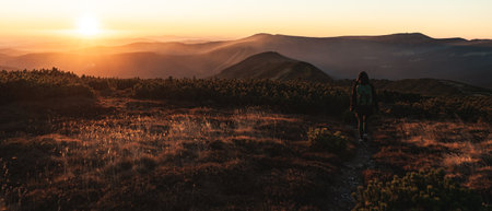 Woman in background walking on a mountain peak when sun is going down, beautiful sunset in Krkonose, Czech Republic