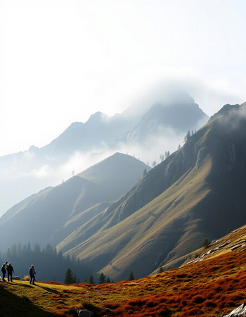 A group of friends on a hiking adventure, panoramic mountain views, capturing the spirit of friendship and exploration. Resplendent.