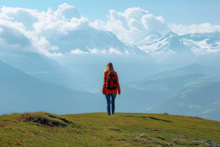 Backpacker enjoying breathtaking scenery while hiking on a winding path through lush green meadows, leading towards majestic snow capped mountain peaks under a cloudy sky