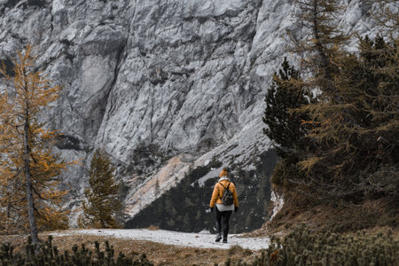 A beautiful view of a female hiker walking on a path in mountains in the alps in Croatia