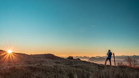 Hiker with backpack standing on top of a mountain and looking at the sun