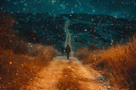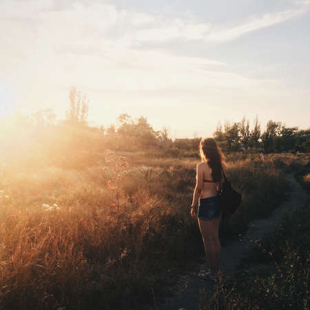 Backpacker walking on a road at sunset, motion blur suggesting movement and travel. Backpacker walking road at sunset journeying towards destination