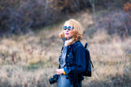 Hiking on woodland trail. Tourist woman on her journey in nature at autumn. Backpacker with hat walking outdoor