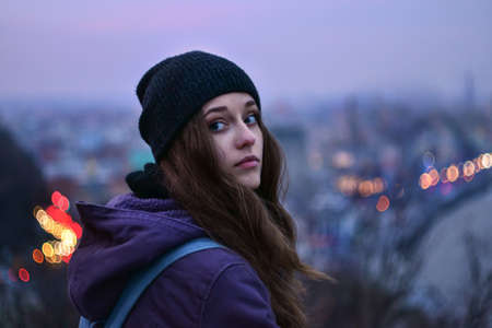 Hipster girl traveler in hat standing in front of winter evening cityscape, purple sky and blurred city lights