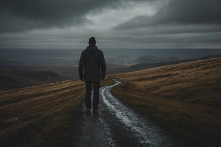 Rear view of a lone person on a hiking path in a barren, hilly landscape, gazing at the immense natural scenery, evoking a sense of adventure and introspection.