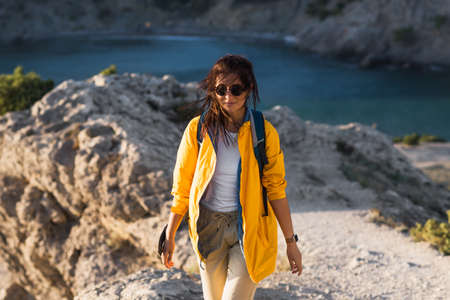 A woman with a backpack on the background of the sea. Portrait of a woman in tourist gear on the background of the sea. The concept of travel and an active lifestyle. A tourist girl on the seashore.