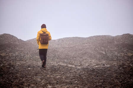 Young Male Traveler in yellow coat and hat with camera relaxing outdoors at foggy weather. vacations and Lifestyle hiking concept. Tourism, travel, trip, nature, people lifestyle concept. side view