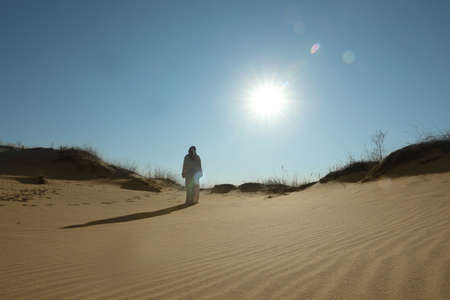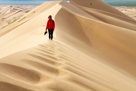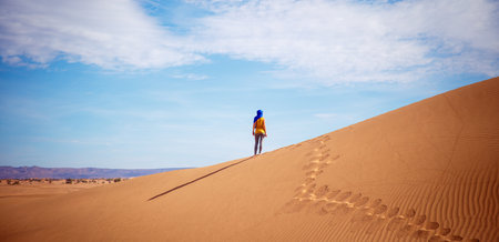 Woman walking in the mongolian desert sand dunes. Young woman walking golden sand on a bright summer day, Mongolia holliday vacation concept.