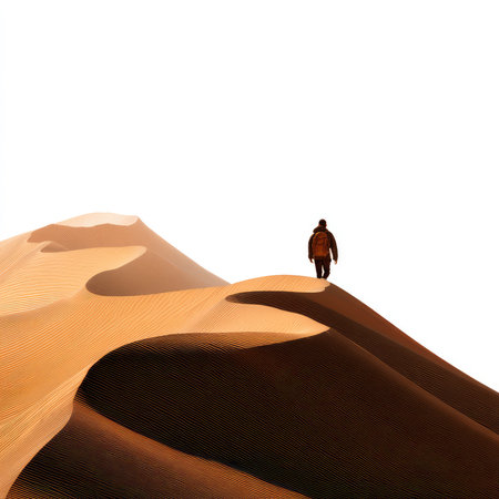 Experience the solitude of a lone hiker navigating through vast dunes, showcasing stunning textures and sunlit shadows in a remote landscape.